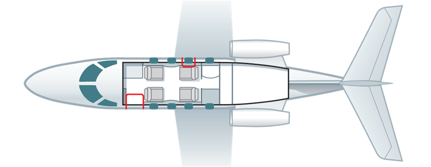 The Phenom 100 is a modern and spacious aircraft due to its interior design and cabin shape. Unlike other VLJ aircraft, it also boasts an enclosed lavatory. Featuring large leather seats, power outlets and multiple controls at your fingertips, the Phenom has ample baggage capacity for between 4-6 cases plus cabin baggage.